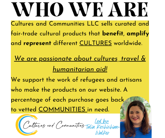 Cultures and Communities was developed in 2023 by combining our passion for cultures, global travel and the expression of art in its many forms. We work every day to demonstrate these components into our brand and are excited to share our curated collections with you all!