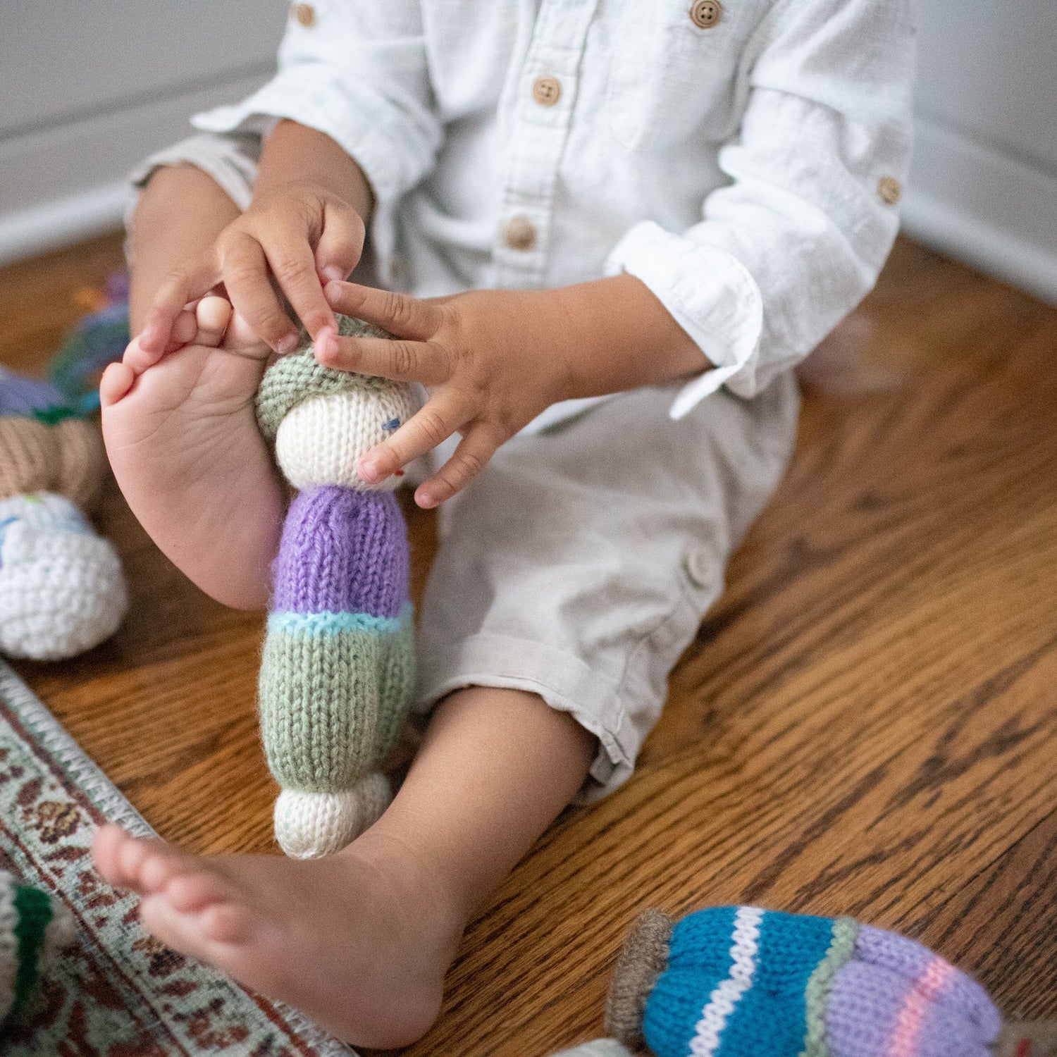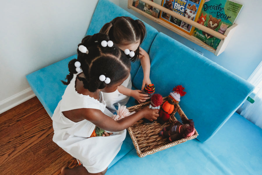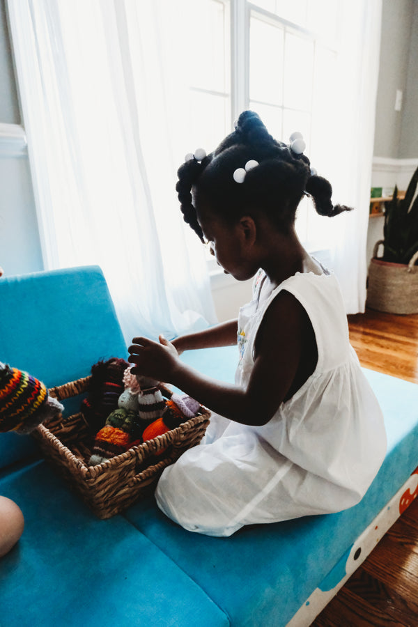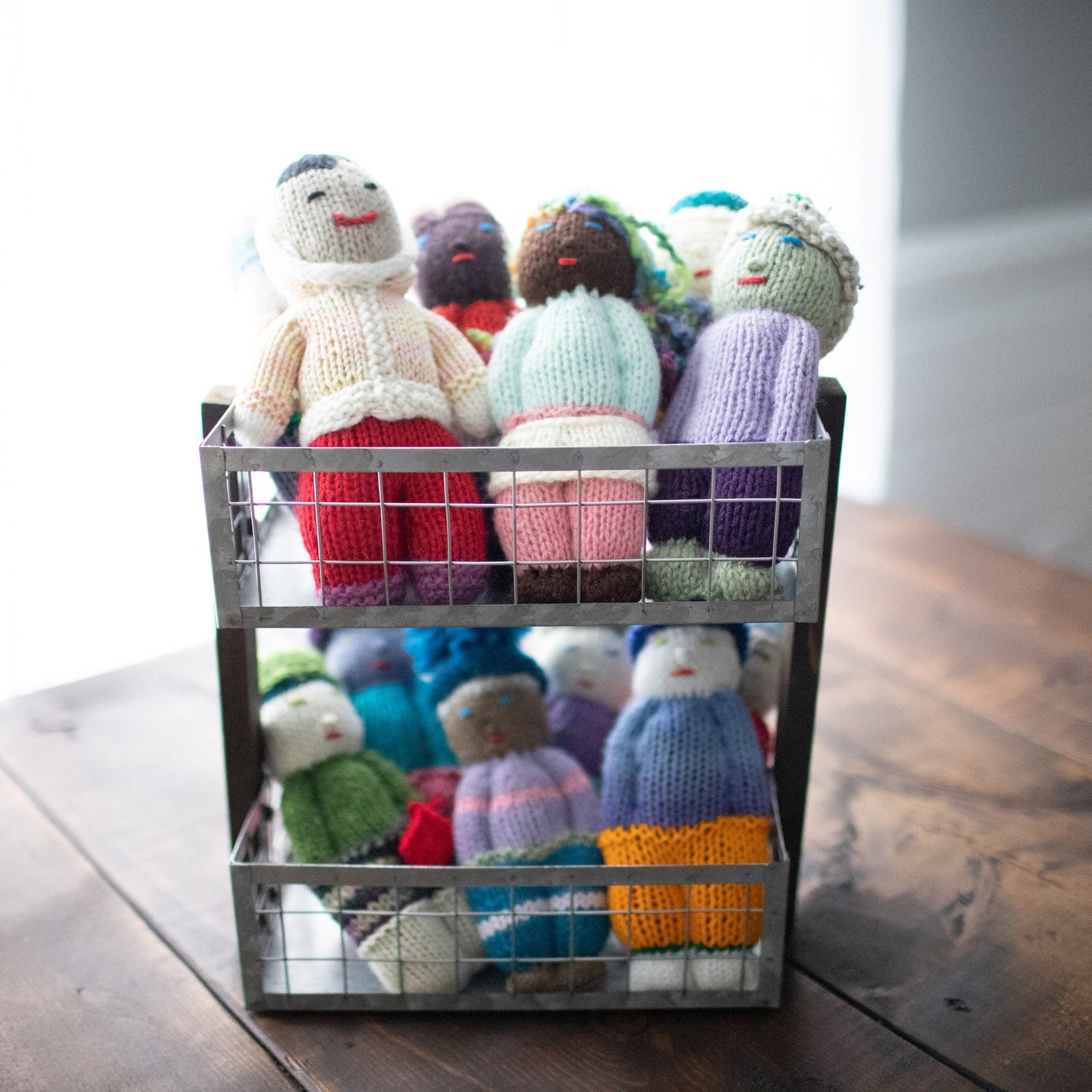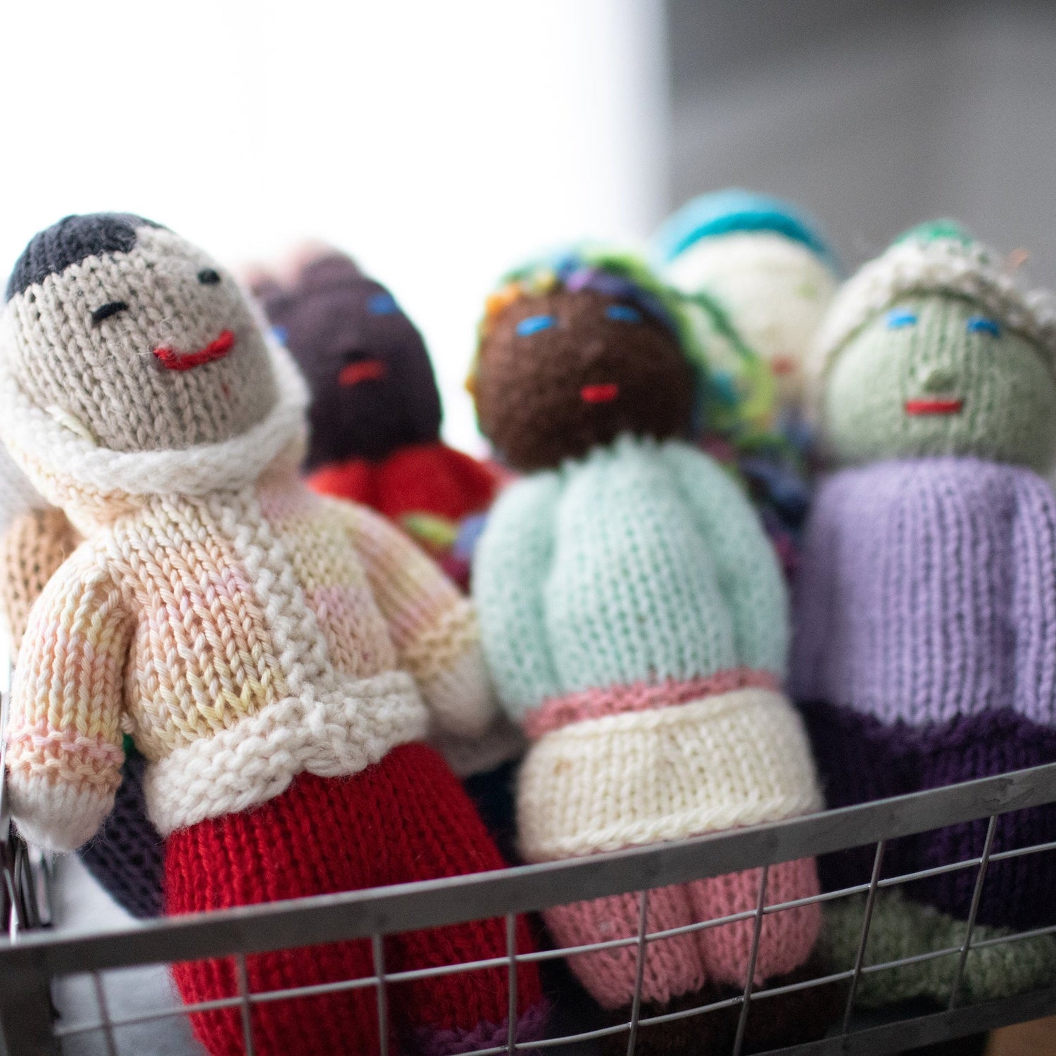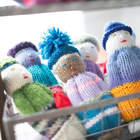 These playful Jou Jou Dolls (8" tall) are made one-by-one by our knitters. Each doll is one-of-a-kind and no two are alike. These dolls are made with love by artisans from donated yarn.