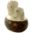 This Elephant with Baby figurine has been hand carved in Ecuador from tagua nuts, a renewable rain forest seed known as vegetable ivory for its likeness to real animal ivory, but with animal and habitat-friendly properties. All colors are achieved using natural techniques, such as boiling, fermentation, burning and inlay, that enhance but don't completely cover the nut's organic beauty. Similar to animal ivory, this figurine will gently antique or darken over time.