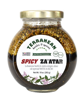 Our iconic Lebanese za’atar spread of dried wild za'atar herb, sumac, and sesame seeds blended perfectly with cold-pressed extra virgin olive oil meets a kick of cayenne pepper! This versatile addition to your kitchen boosts flavor with added spice.