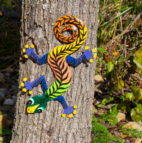 Colorful Gecko Haitian Steel Drum Wall Art, 13 inch Black Stripes