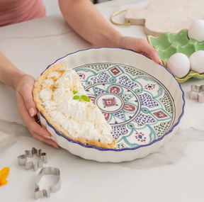 This Marrakesh Pie Platter is handmade by experienced artisans in Marrakesh, the city of color and warmth. The colors are full of joy and very inviting. The platter features colorful ruffle details on the edges. This platter will become your go-to serving platter for your favorite pie or dish.