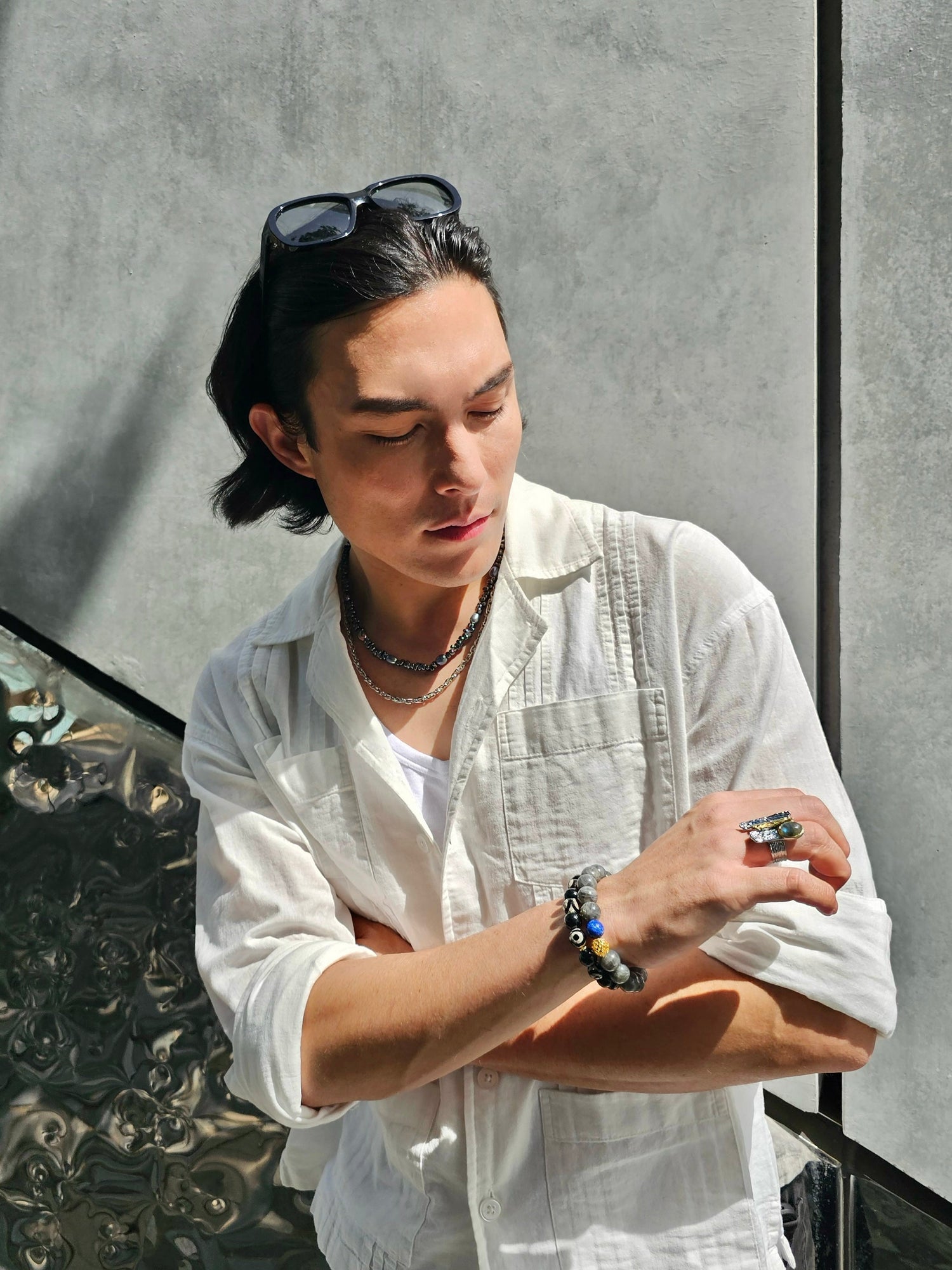 This bracelet features unique Dzi agate beads, known for their distinctive patterns and rich history in traditional jewelry. The contrasting black and white tones create a bold statement, making it a versatile addition to any outfit, whether casual or formal.