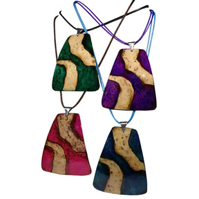 Our Large Trapezoid-Shaped Calabash necklace and earring sets with a Water design are bright and vibrant. They are hand painted on pieces of calabash and covered with a clear finish. The necklaces have an adjustable knot closure so you can wear them at the length you wish. Our earrings have a sterling silver hook coil wire.