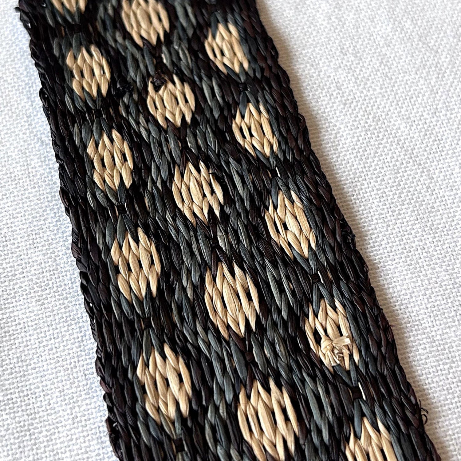 This handwoven, finely detailed raffia bookmark is the perfect accent for a favorite book. It is crafted using the traditional artisan technique of card weaving, otherwise known as tablet weaving. Its gorgeous texture, smooth sheen, unique plant fiber material, and mid-century modern patterning make this an inspired gift.