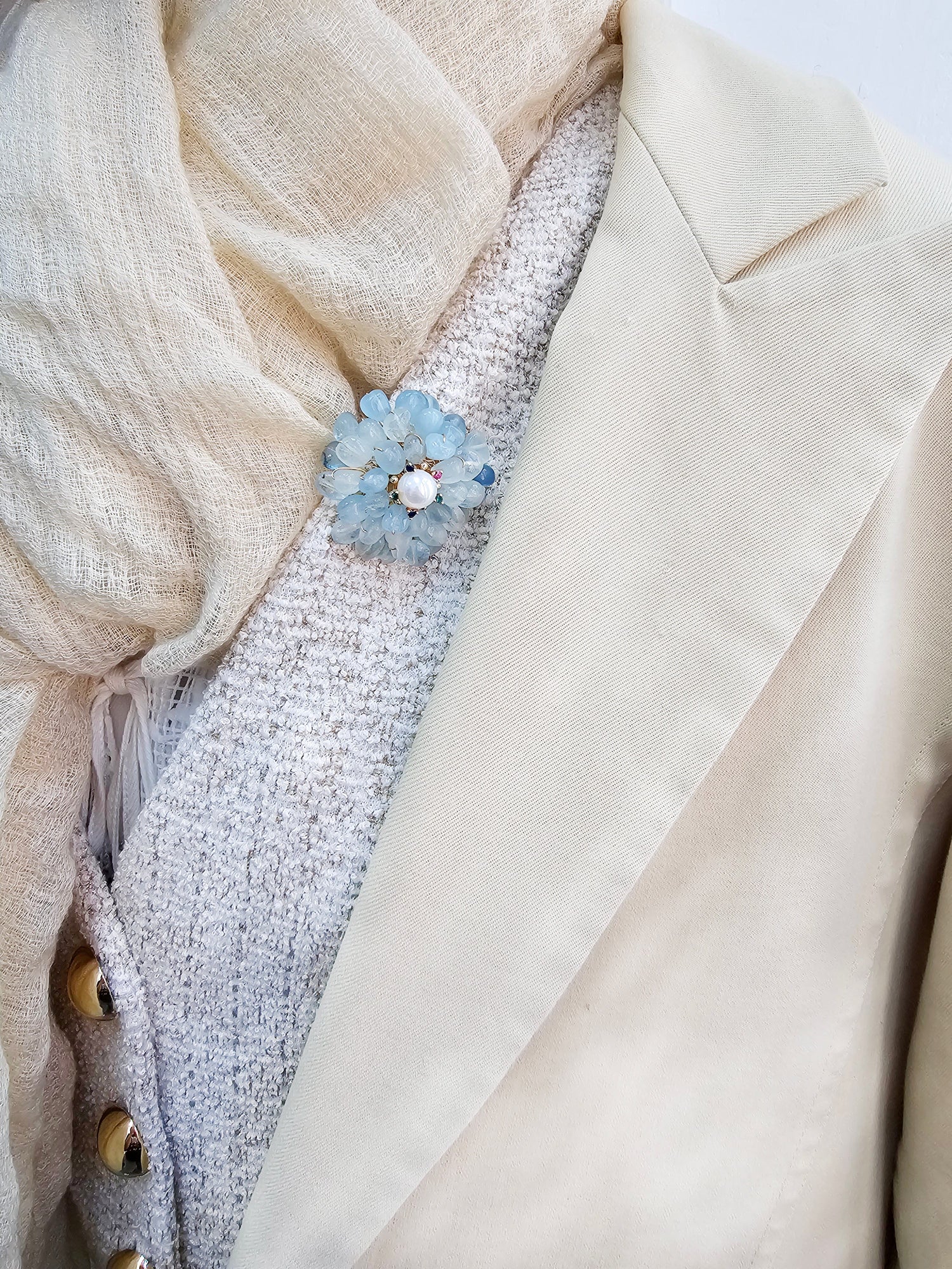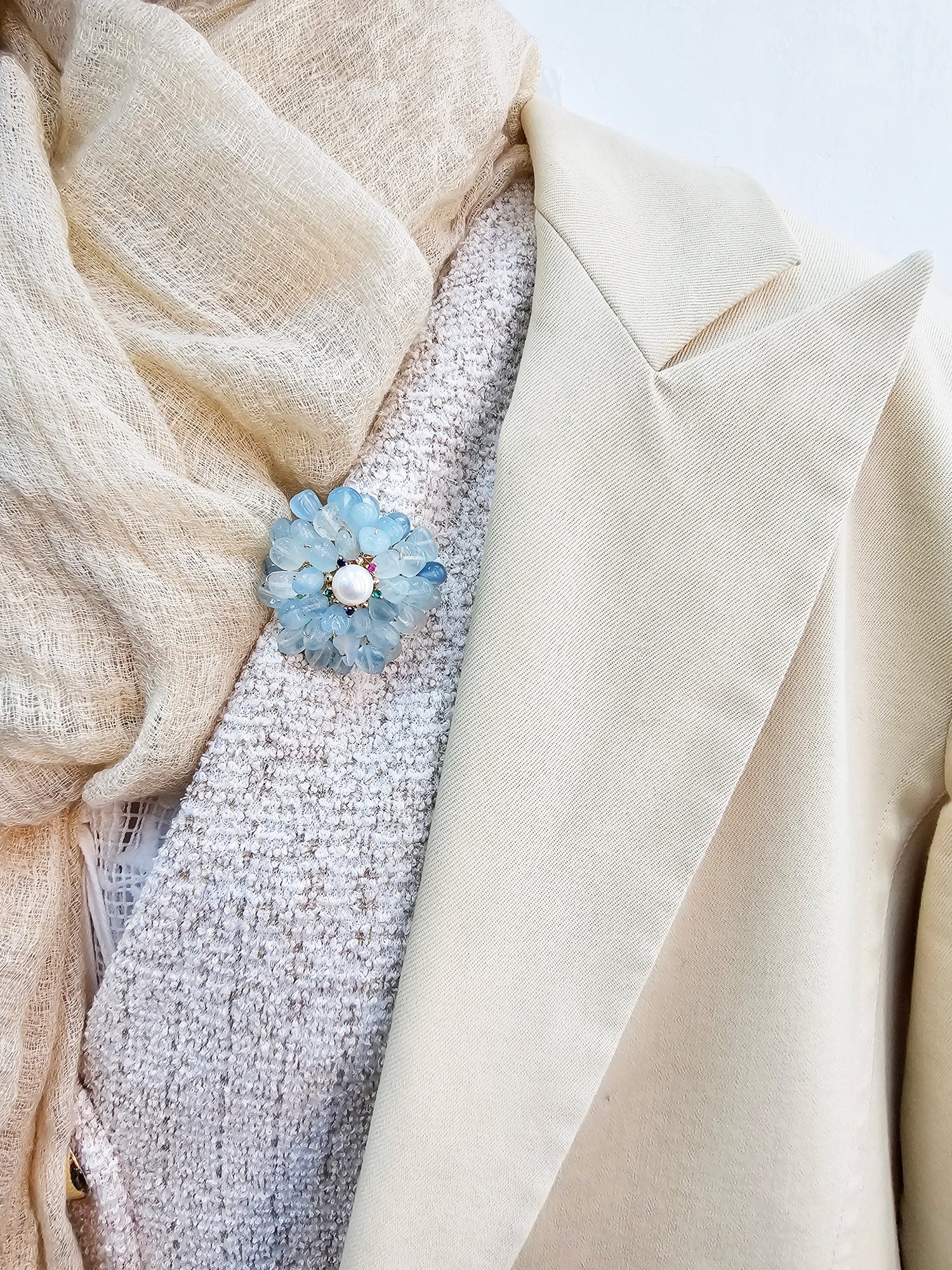 The focal point of this brooch is the natural aquamarine gemstones arranged in the shape of a flower. The aquamarine stones, known for their soothing blue hues, evoke a sense of tranquility and elegance. The flower design adds a touch of femininity and grace to the brooch, making it a versatile and eye-catching piece.